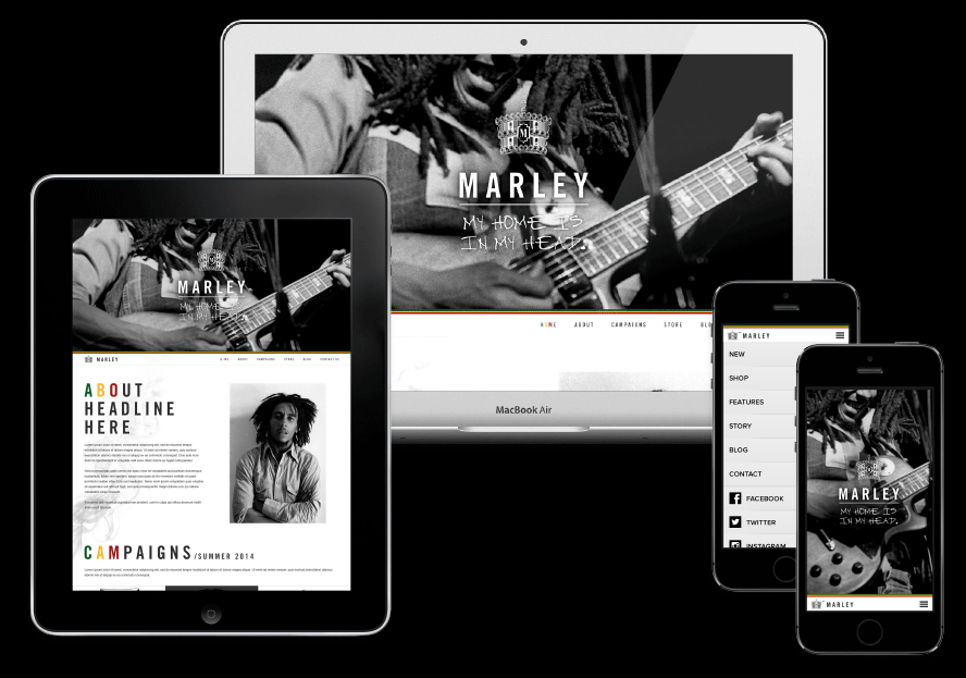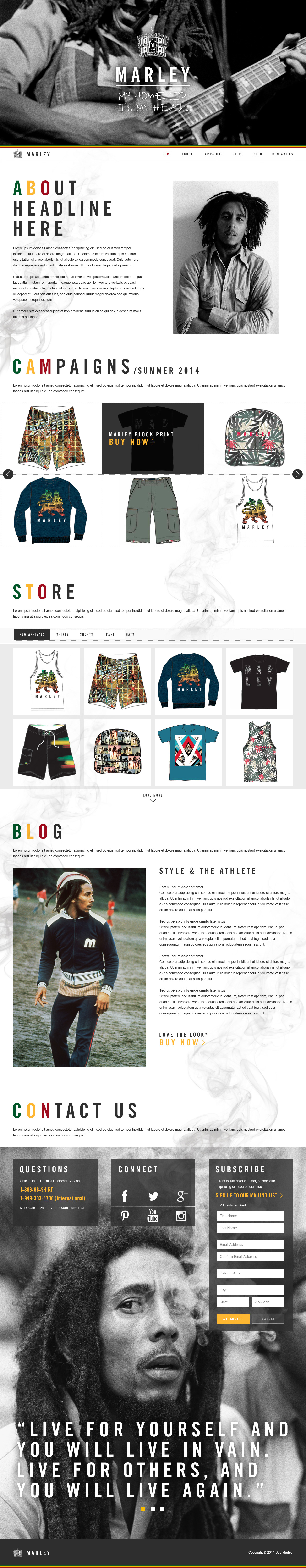 Bravado (Universal Music) wanted to refresh their Bob Marley merchandising site. I designed this to be responsive while also satisfying client request for simple parallax scrolling. As one scrolls down the page, smoke continually plumes up the page from Bob himself who is anchored at the bottom. The top section features a loop of select videos of Bob experiencing life as he loved it.