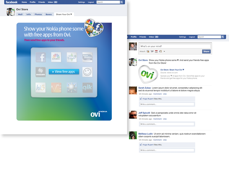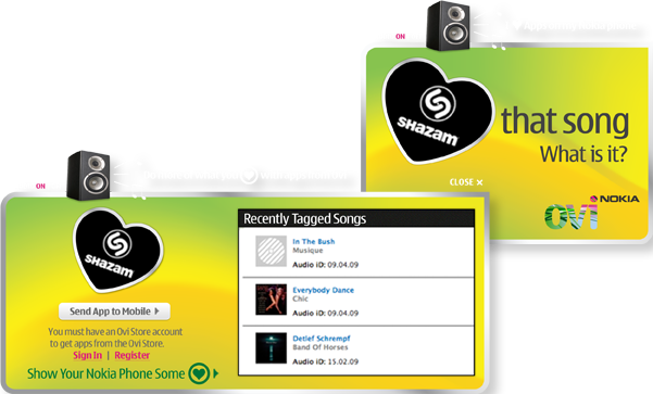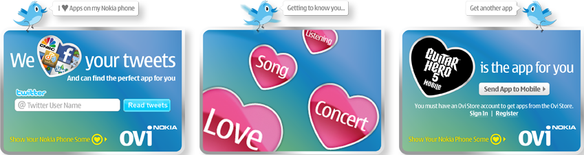 This campaign encouraged people to share what they love by downloading socially connected apps like Facebook, Photobucket, Qik and Shazam at the Ovi Store to their Nokia device. The movement was fueled by a series of branded web-based social widgets and applications that were distributed to mobile influencers and Nokia fans. Each app brought the power of the Ovi Store to its interface while easily allowing Nokia owners to Share the Love with friends and followers. Widgets used Twitter's open API to send automated tweets to the followers about the apps they love the most in the Ovi Store! We created the first mobile app store on Facebook and used Facebook’s core sharing functions that enabled fans to Share the Love with their friends via branded Love Notes. We turned rich media buys into Love machines. A rich media unit used Twitter’s API to scan your key words and recommend an app you might love at the Ovi Store. Another rich unit used Shazam's API to listen to music and feature recently tagged songs.