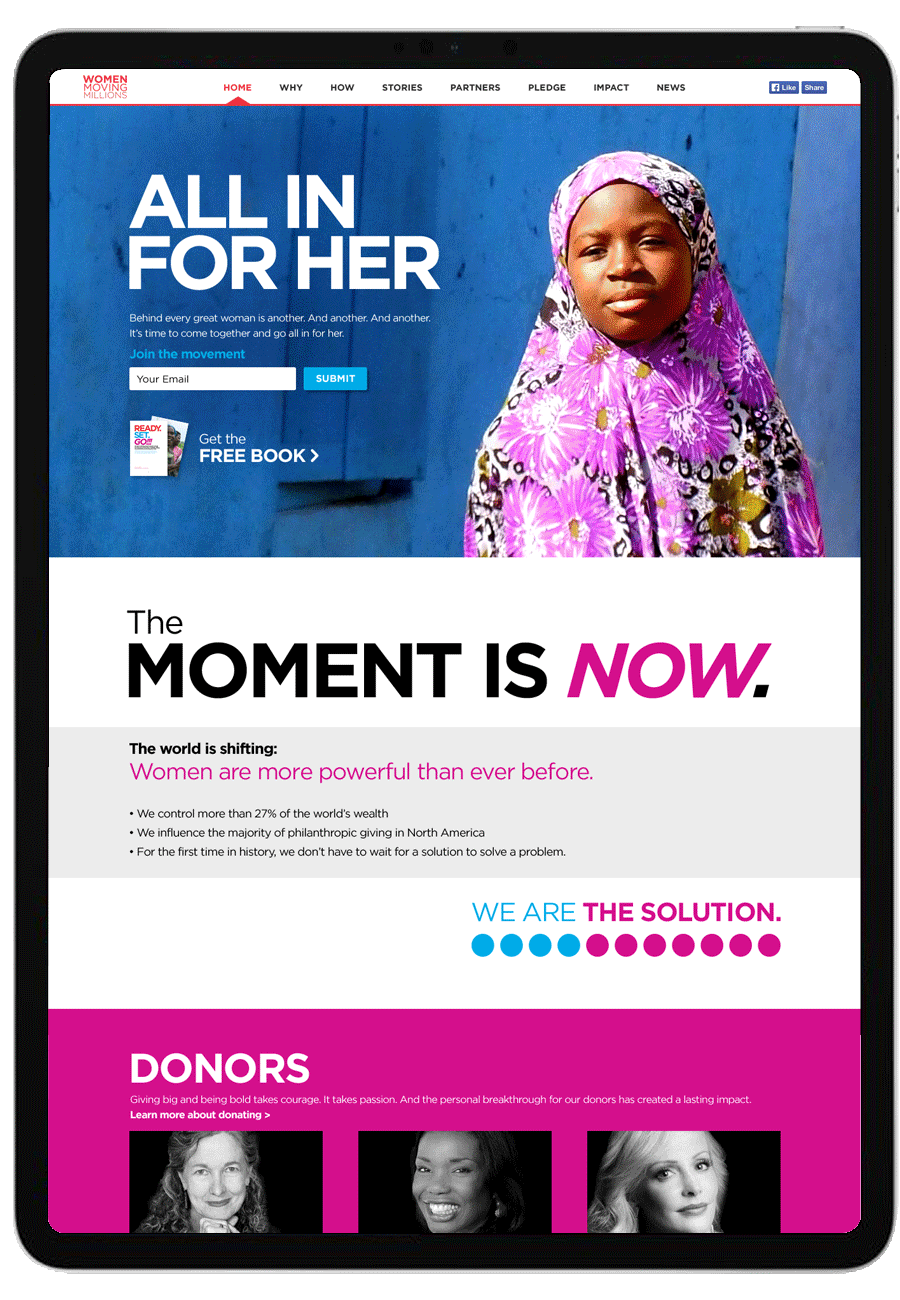 Behind every great woman is another. And another. And another. Women Moving Millions inspires prestige individuals to give BIG ($1 million+), driven by data that confirms when resources are accurately directed toward women's causes, communities and societies thrive as a whole. I art directed the creation of AllinForHer.org, a site to support the organization's annual summit.
